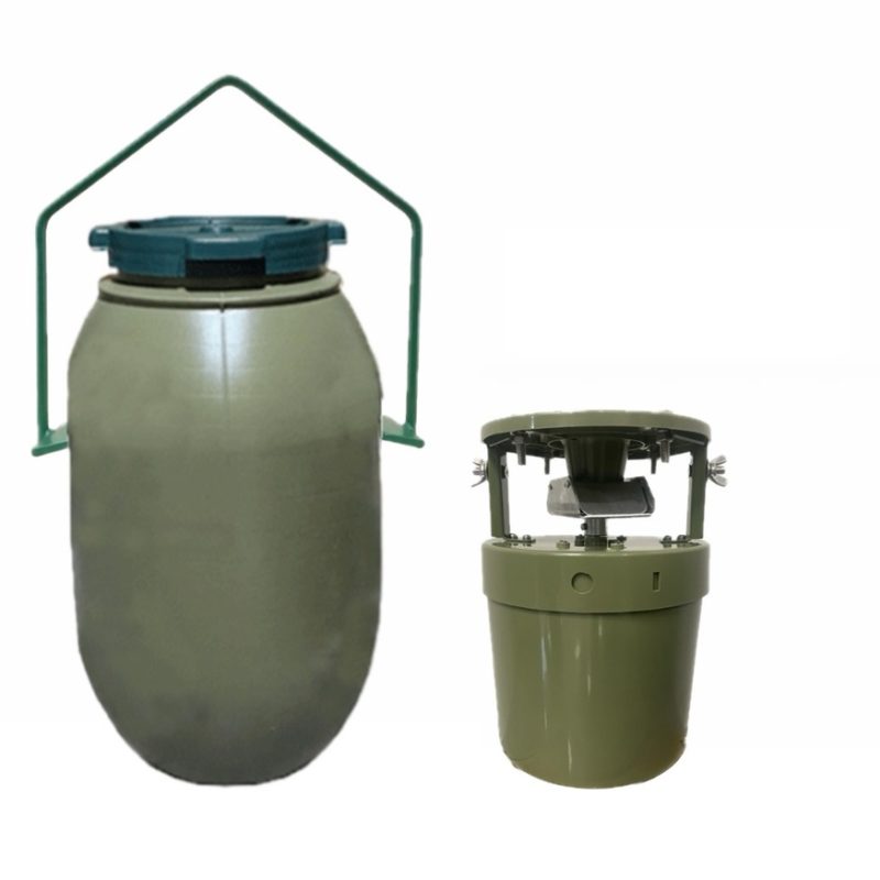 El Comedero de caza bidón de suelo 60 L está recomendado para jabalí, corzo y venado, incluso para alimentación de animales domésticos. Los animales moverán y empujarán el bidón, el cual estará anclado al suelo mediante la piqueta, unida por una cadena de 1 m, permitiendo que se dispense el grano en un diámetro de 2 m a través de sus 6 agujeros. Fabricado en plástico rígido, siendo resistente a todo tipo de clima, con capacidad de 60 L, tapa a rosca, color verde y tamaño de 68 x 38 x 38 cm.
